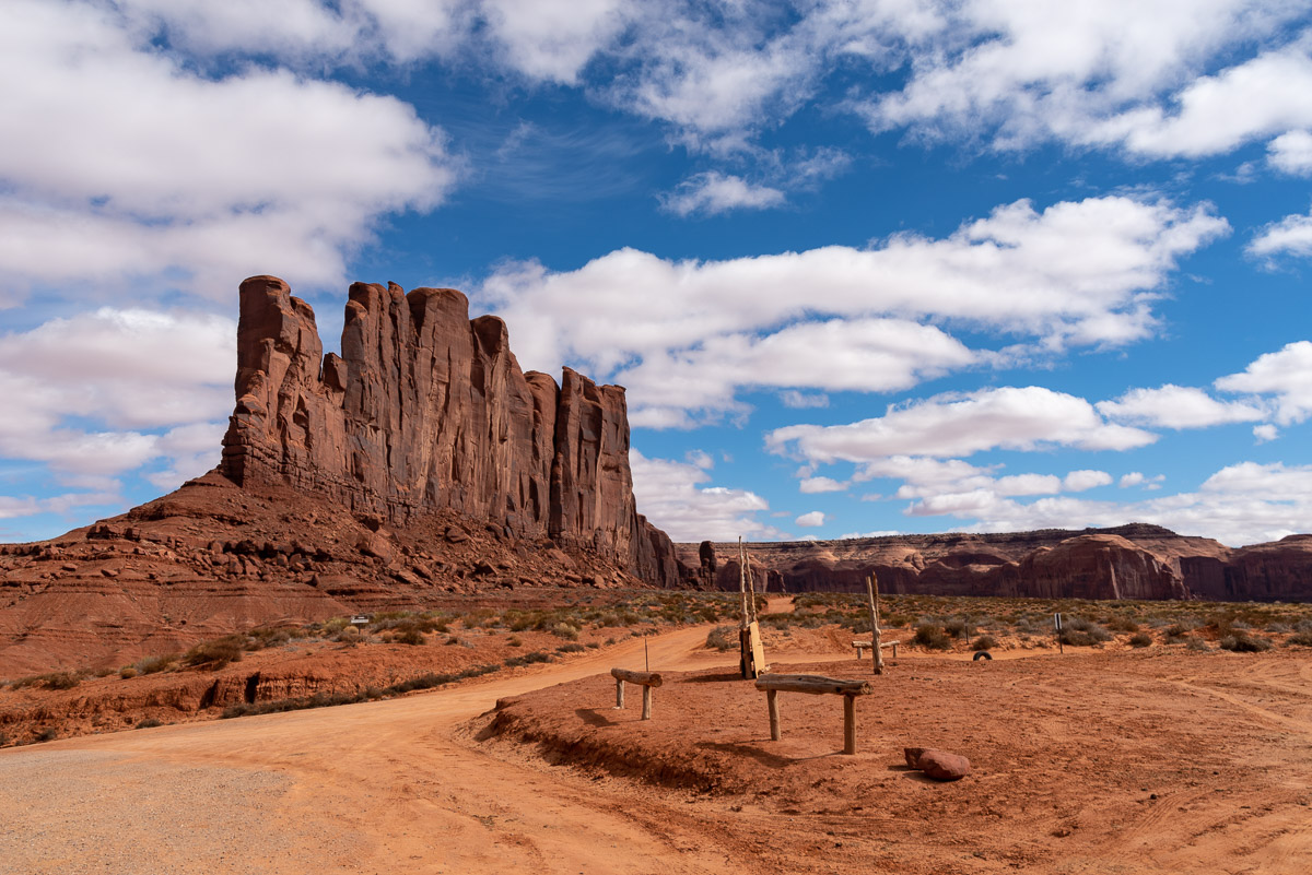Siamo in bassa stagione e i turisti non sono ancora arrivati. Qui vediamo un possente monolito, il Camel Butte e in primo piano igli attacchi per le briglie dei cavalli.