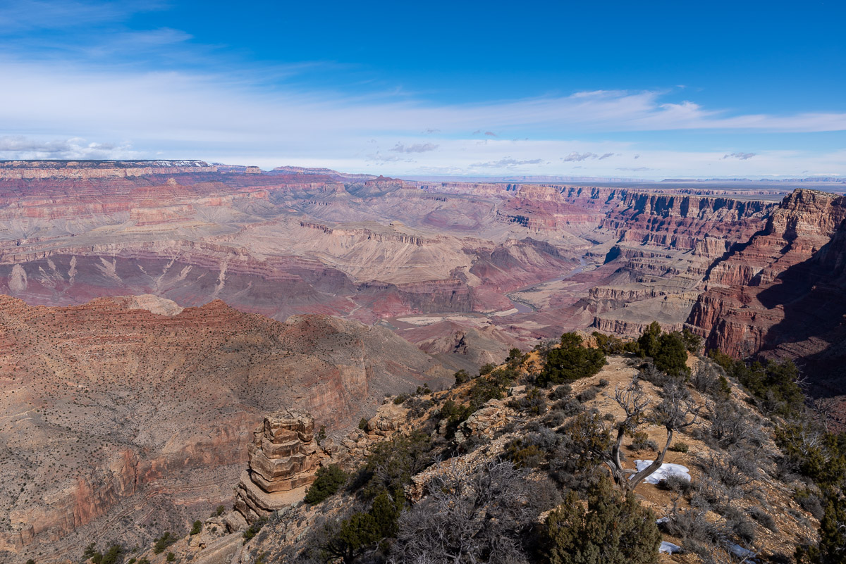 Siamo a febbraio, il fiume Colorado per milioni di anni ha scavato i sedimenti di un antico mare per oltre mille metri sulla destra è rimasta della neve invernale. |
